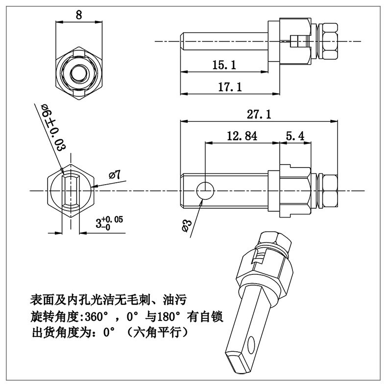 臺燈金屬支架轉(zhuǎn)軸的軸套為六邊形,軸件銑扁,裝配時從臺燈活動關(guān)節(jié)一側(cè)壓入即可使用,軸件固定,軸套轉(zhuǎn)動。